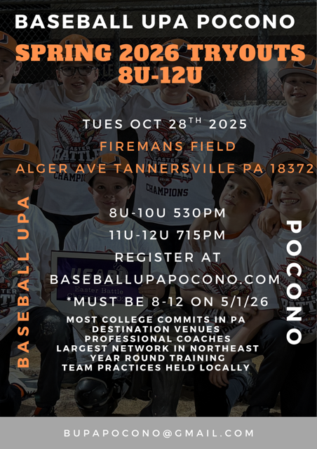 Baseball UPa Pocono is proud to offer our spring/summer 2026 tryouts for our 8U-12U prospective players. All players must be between the ages of 8-12 on or after 5/1/26 to be eligible for this tryout. Please register above from our programs drop down and we look forward to seeing you on October 28th, 2025.
